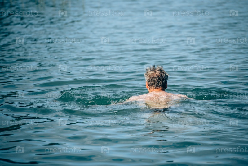 Мужчина купается в озере летом — вид со спины