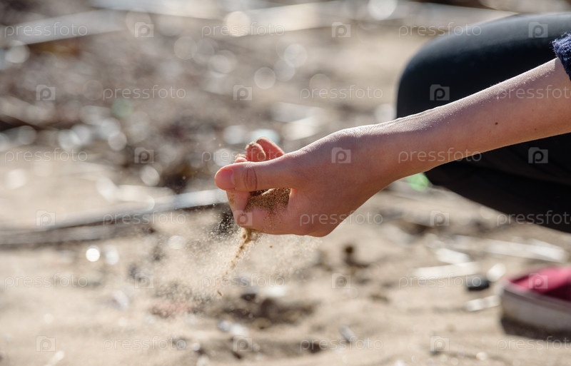 Рука льет коралловый песок на пляж