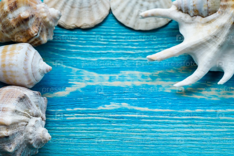 Летний морской фон - ракушки на деревянном синем фоне