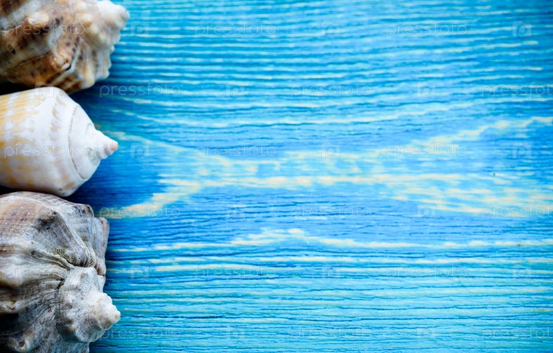 Летний морской фон - ракушки на деревянном синем фоне
