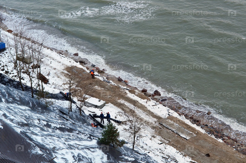 Строительство берегоукрепительных сооружений, строительство морской набережной, строительная техника на пляже