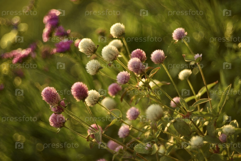 Гомфрена шаровидная. Красные и белые сферические цветы в летнем саду. Размытие разноцветного фона