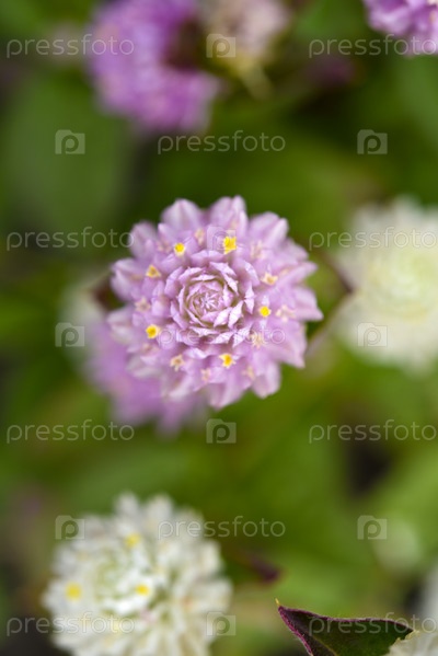 Гомфрена шаровидная. Красные и белые сферические цветы в летнем саду. Размытие разноцветного фона