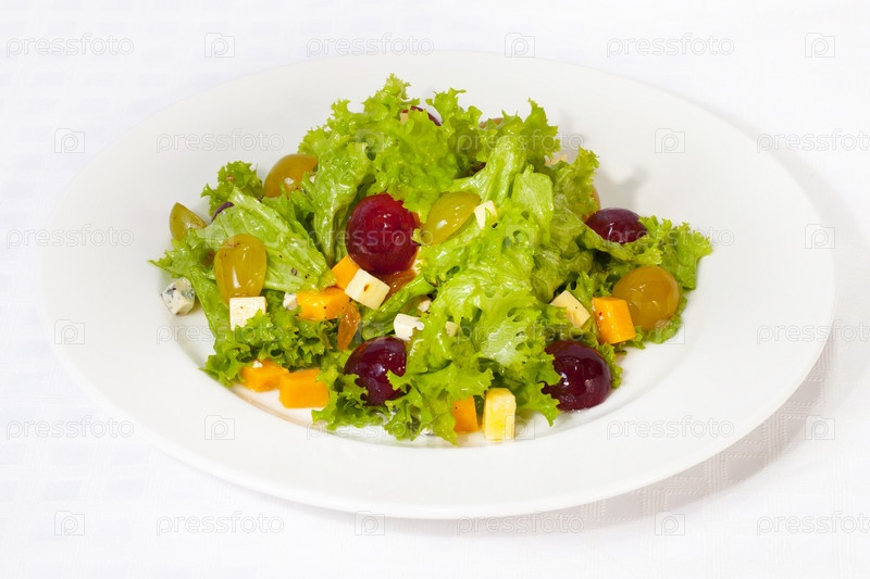 Салат с виноградом,сыром и апельсином на белом фоне