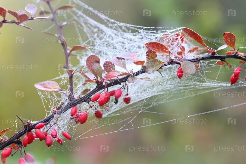 Ветки барбариса покрытые осенней паутиной