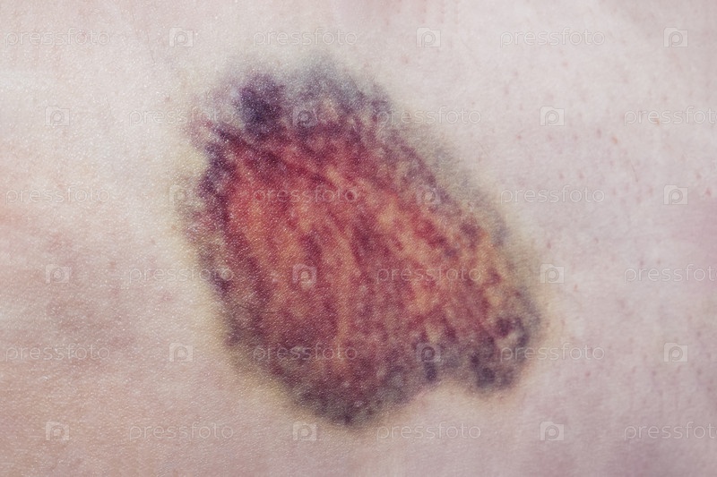 Сиренево-красный синяк на светлой коже крупным планом