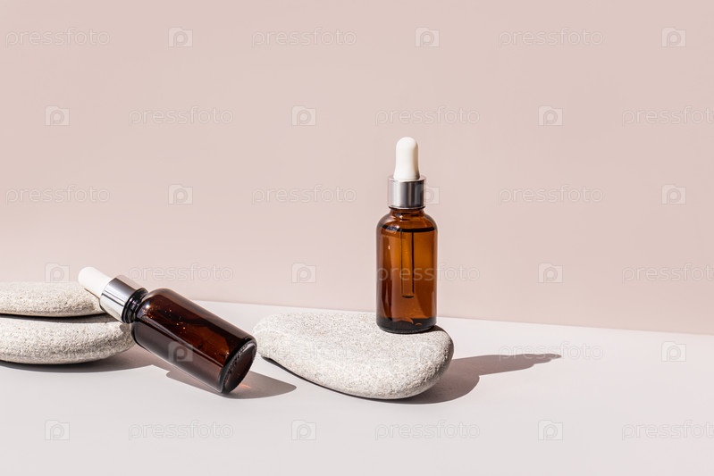 Два косметических флакона с органическим натуральным уходом за собой. Один стоит, другой лежит на серых морских камнях. место для текста. бежевый фон