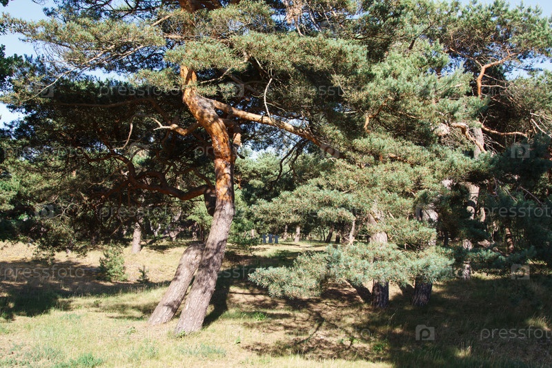 Согнутые ветром сосны в лесу в летний солнечный день. Россия Калининград
