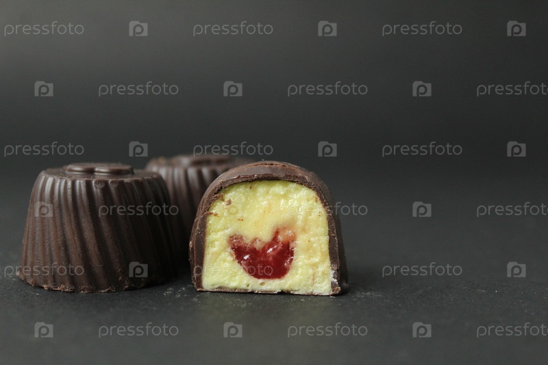 Шоколадная конфета с начинкой из манго, маракуйи, вишни, малины с желтой и красной начинкой на черном фоне с местом для текста и копировального пространства. Вкусные сладости, сладости, день без диеты, шоколад, десерты к чаю, кофе