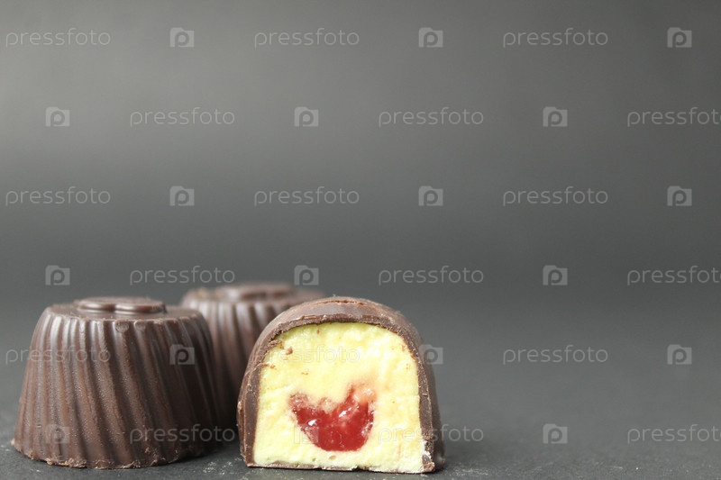 Шоколадная конфета с начинкой из манго, маракуйи, вишни, малины с желтой и красной начинкой на черном фоне с местом для текста и копировального пространства. Вкусные сладости, сладости, день без диеты, шоколад, десерты к чаю, кофе
