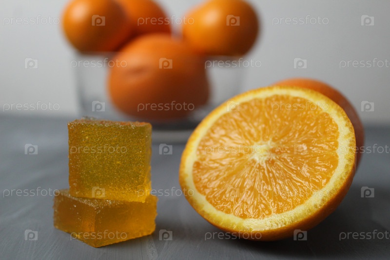 Полезные десерты: рядом лежат апельсиновый мармелад, апельсиновый десертный кубик, апельсин на сером фоне. Сезонные, полезные десерты, национальные сладости. День без диеты