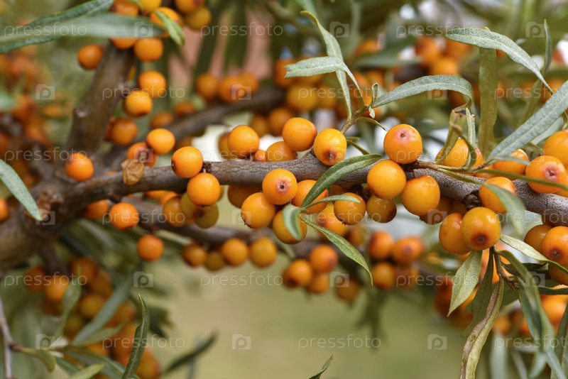 Спелые ягоды облепихи на ветвях. Оранжевые ягоды