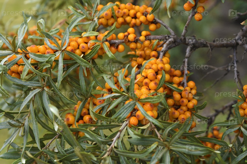 Спелые ягоды облепихи на ветвях. Оранжевые ягоды