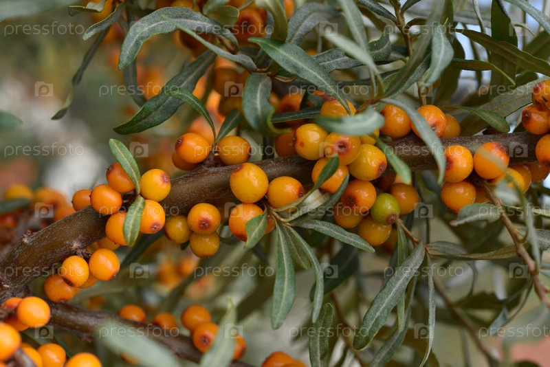 Спелые ягоды облепихи на ветвях. Оранжевые ягоды