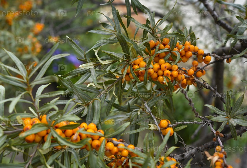 Спелые ягоды облепихи на ветвях. Оранжевые ягоды