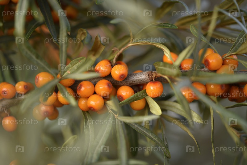 Спелые ягоды облепихи на ветвях. Оранжевые ягоды