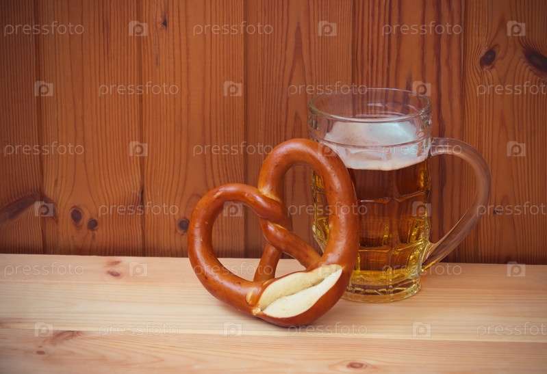 Пивная кружка и крендель на деревянном столе. Посмотреть с копией пространства