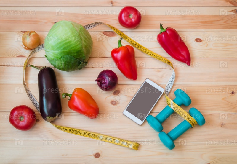 Концепция здорового питания и фитнеса. Овощи, зеленые гантели, смартфон и измерительная лента