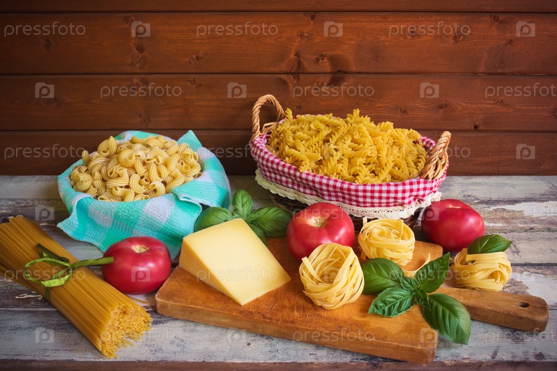Сырые макароны, помидоры, листья базилика и сыр на деревянном столе