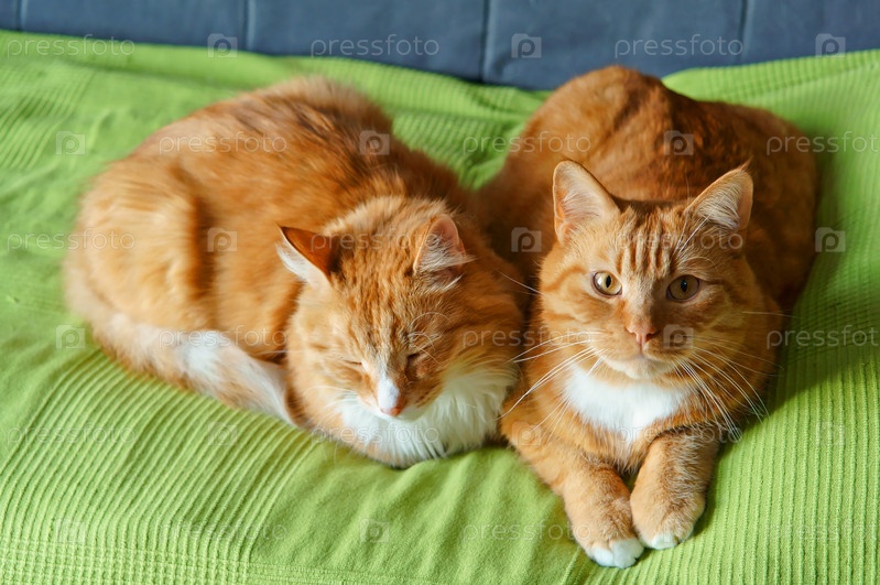 Две рыжие кошки лежат на диване, рыжие красивые домашние кошки на зеленом одеяле