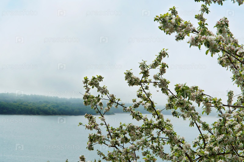 Цветущие деревья в тумане, туман и цветущие яблони над озером
