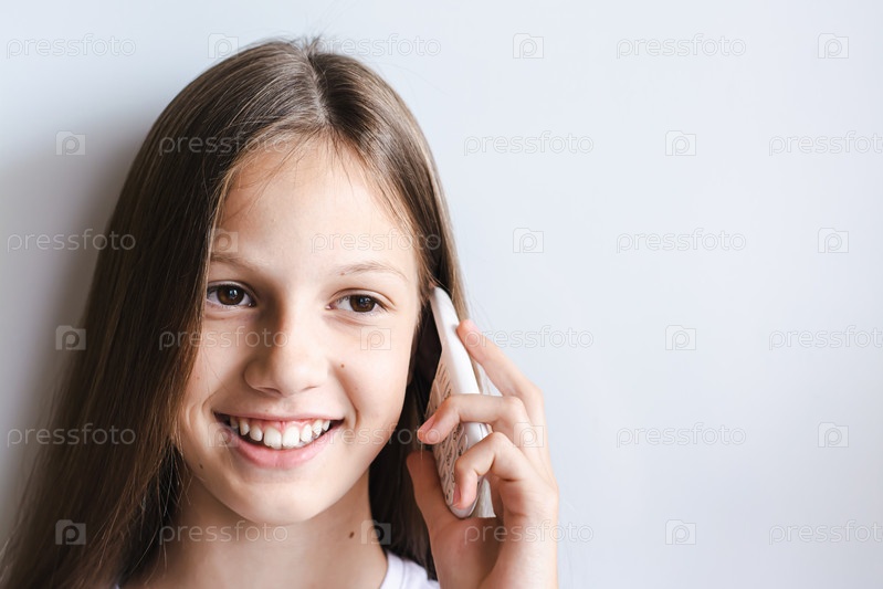 Улыбающаяся девочка-подросток разговаривает по белому кнопочному телефону