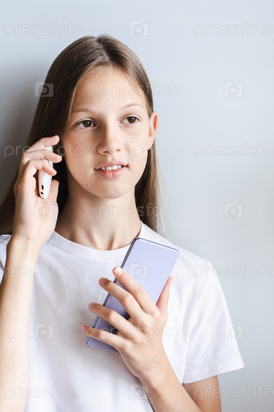 Улыбающаяся девочка-подросток разговаривает по кнопочному телефону и держит в руке смартфон