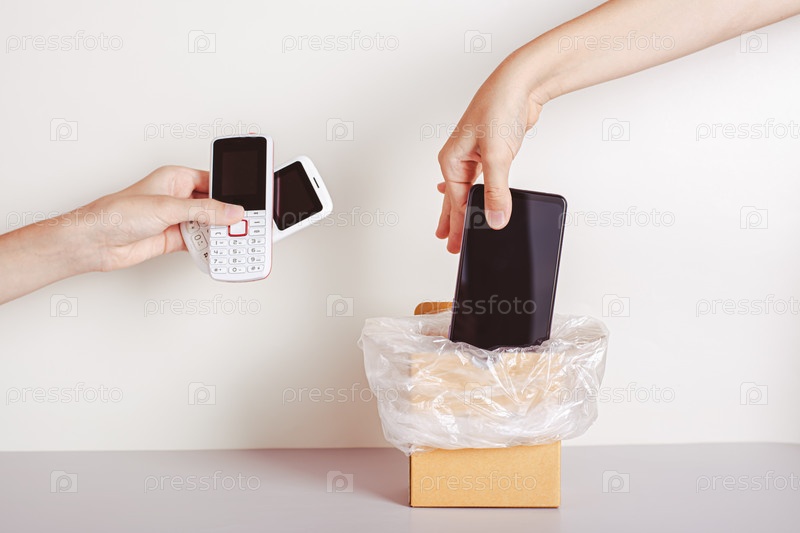 Рука выбрасывает смартфон в мусор, а вторая рука держит кнопочные телефоны