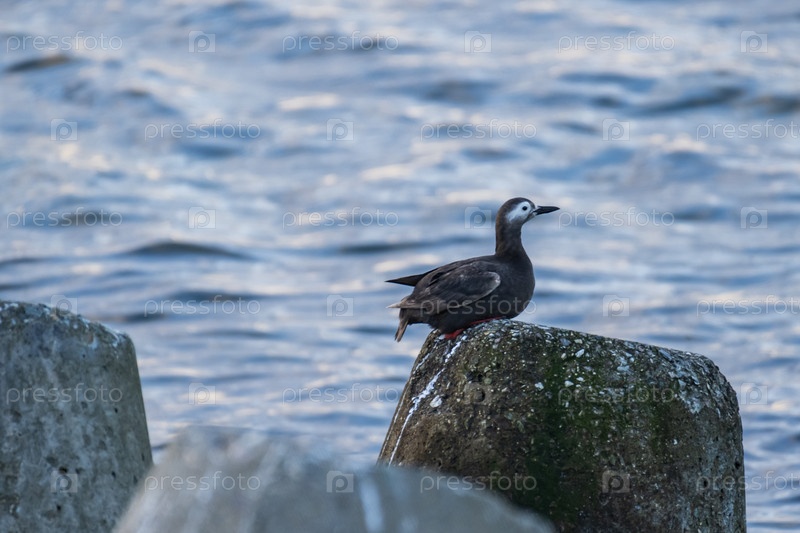 Черная утка на камне в воде