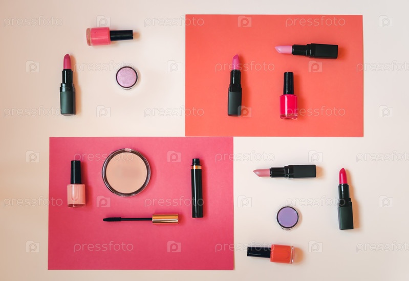 Косметика для макияжа и лаки для ногтей на цветном бумажном фоне