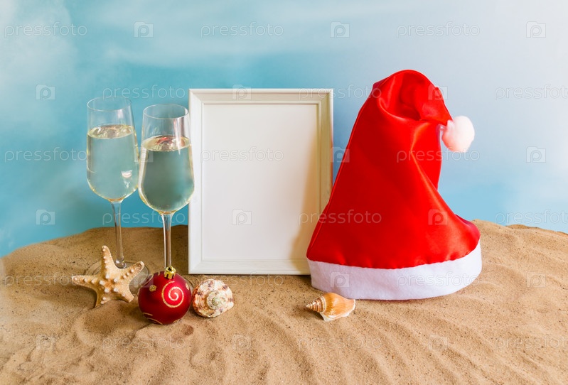 Бокалы для шампанского, рождественский шар, шляпа Санты и рамка на песчаном пляже на синем фоне. Празднование Рождества и Нового года