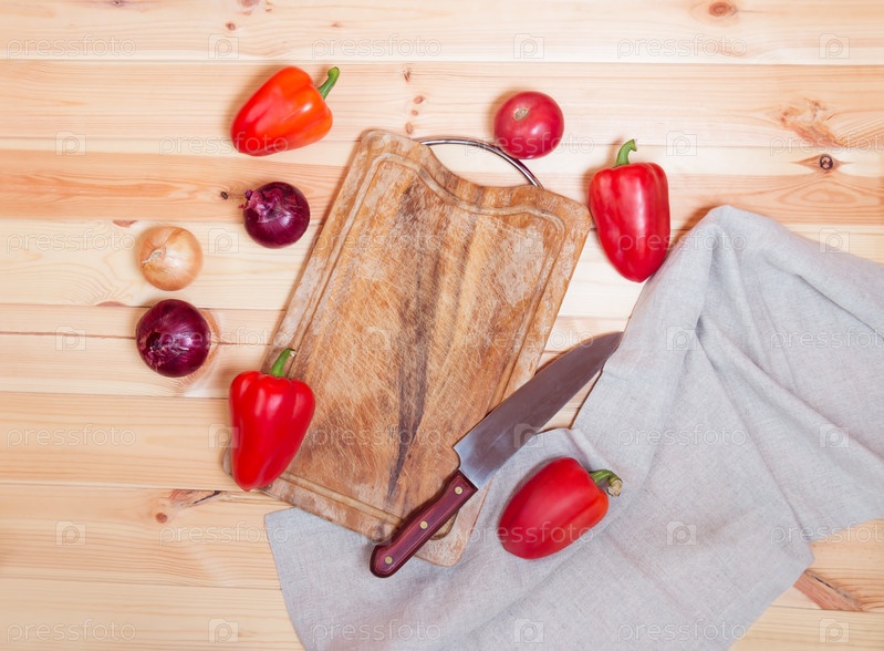 Разделочная доска, нож и свежие овощи на деревянных фоне. Вид сверху