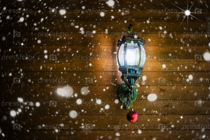 Фонарь с рождественским красным шариком на деревянной стене. Посмотреть с копией пространства