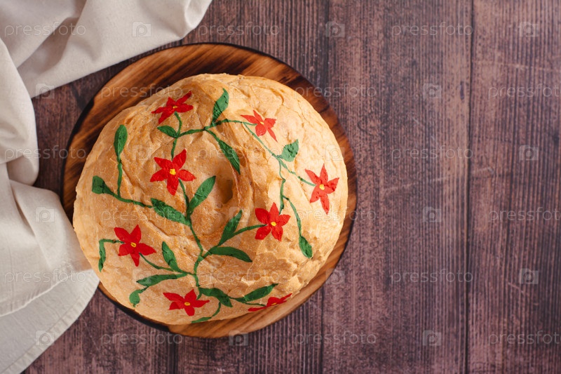 Буханка хлеба, расписанная вручную съедобными красками на деревянной доске, вид сверху