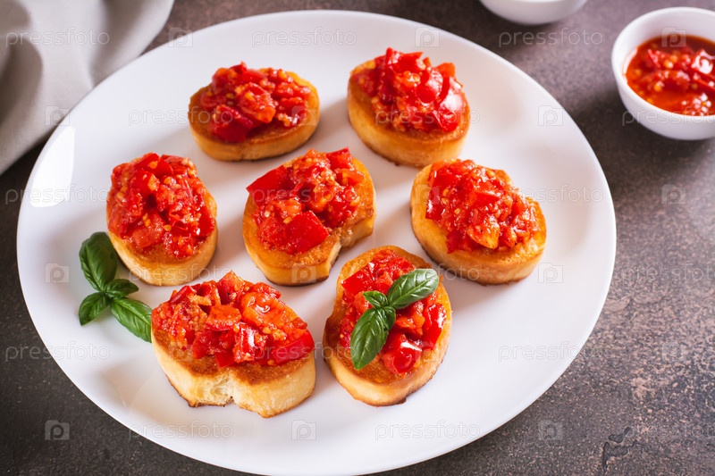 Бутерброды на тосте с жареными помидорами и чесноком на тарелке