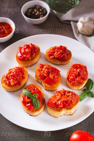 Бутерброды на тосте с жареными помидорами и чесноком на тарелке, вертикальный вид
