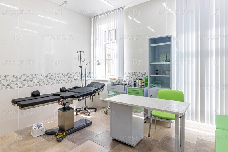 Современный интерьер медицинского кабинета с рабочим местом врача и смотровым столом