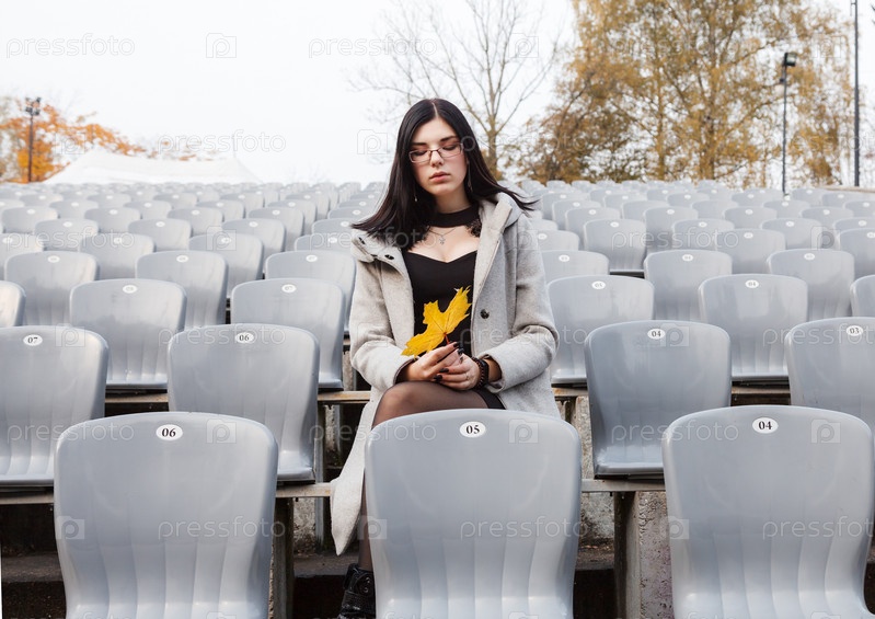 Молодая девушка в сером пальто сидит на сиденье пустого стадиона