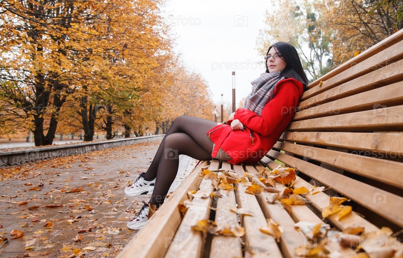 Молодая девушка в красном пальто сидит на скамейке в городском парке