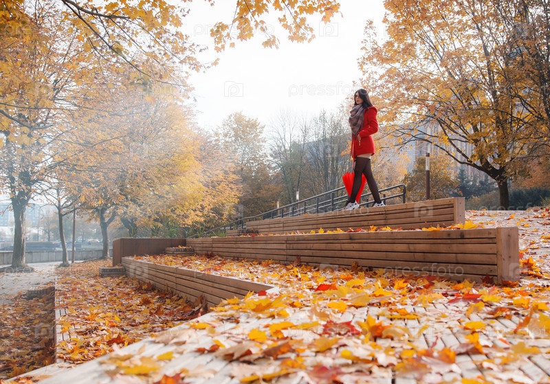 Молодая девушка в красном пальто с зонтиком стоит на переулке