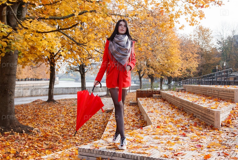 Молодая девушка в красном пальто с зонтиком стоит на переулке
