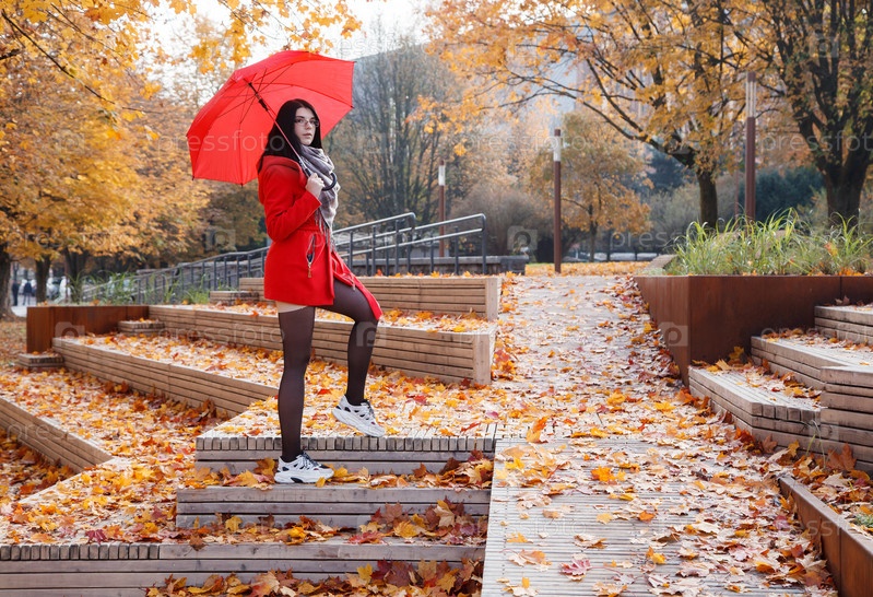 Молодая девушка в красном пальто с зонтиком стоит на переулке