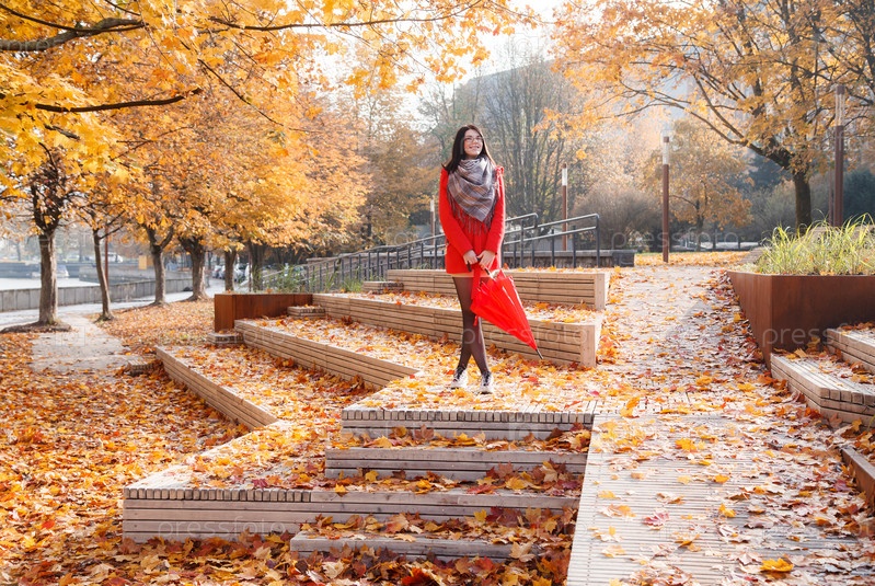 Молодая девушка в красном пальто с зонтиком стоит на переулке