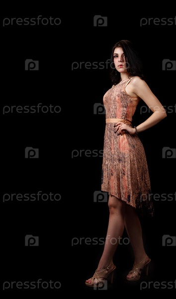 Молодая красивая брюнетка в бежевом платье позирует, стоя в студии на черном фоне