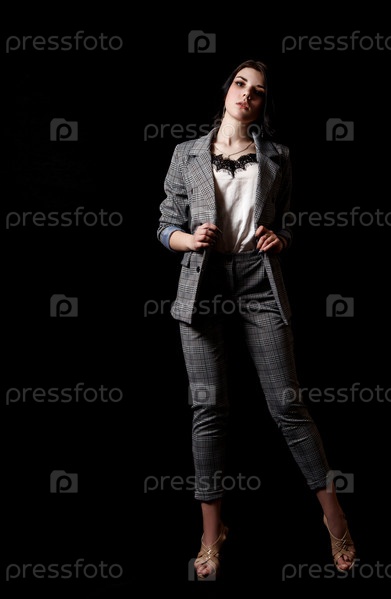 Молодая красивая девушка в деловом костюме позирует, стоя в студии на черном фоне