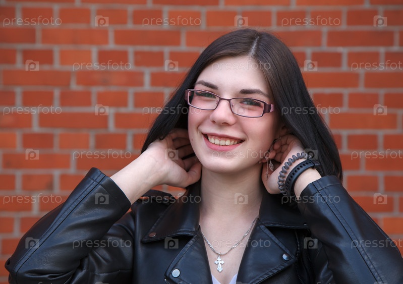 Портрет молодой красивой брюнетки улыбающейся девушки возле кирпичной стены. крупным планом на открытом воздухе