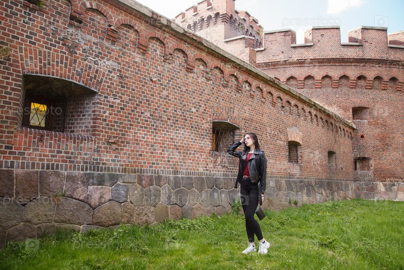 Молодая красивая девушка в черной куртке и джинсах стоит возле старой крепостной стены в солнечный день. Калининградский областной музей янтаря