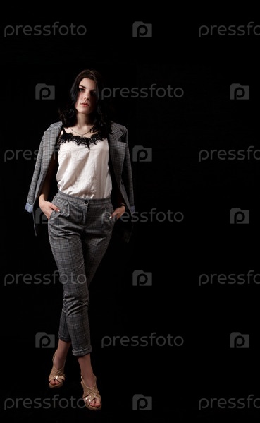 Молодая красивая девушка в деловом костюме позирует, стоя в студии на черном фоне