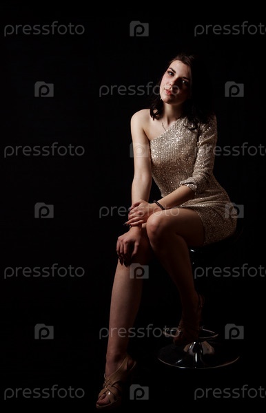 Молодая красивая девушка позирует сидя на стуле в студии