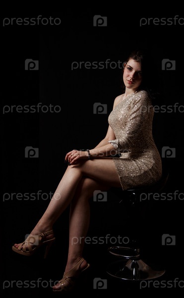 Молодая красивая девушка позирует сидя на стуле в студии